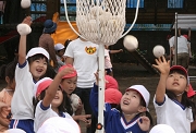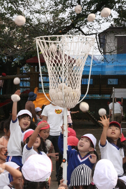 運動会は8日に終わりました。でも子どもたちはまだまだ、楽しみたいのです。年長さんのダンスの輪に入る年少さん。年中の玉入れに参加する年長さん。組み立て体操に入れてもらって大満足の年中と年少さん。こうして、ひなぎくの運動会は続いていきます。