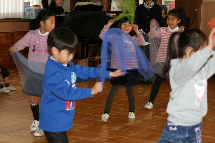 腰をかがめ、体をつなげて、クラスのみんなで長いへびの表現。友だちと目配せして動き出したへびはとても立派。全員で気持ちを合わせてひとつの表現ができるのも、年長だからこそですね。