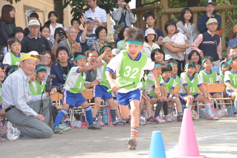年少組は自分たちで作ったバナナの実を、走って取ってカゴに収穫します。よ~く周りを見て、空いているところのバナナを狙ってさっともぎ取っていく子ども。他にもあるのに、同じ一本のバナナを取り合ってなかなかゴールできない子どもたちもいます。年少組らしい、ほのぼのとしたかけっこです。