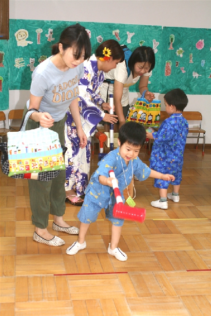 夏休みに入る前の土曜日、幼稚園では《夏のつどい》が行われました。いつもと違って今日は、夕方になってからの登園です。浴衣や甚平姿の子どもたちが学年毎に集まってきました。今年はどんな楽しいことが待っているのかしら!