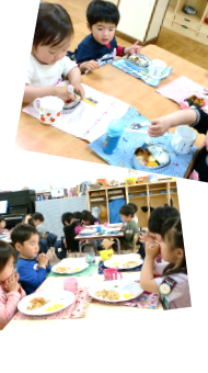 年少組は、先月の「母の日参観」でお弁当の様子を見て頂きましたので、今日は「給食」についてお伝えします。キッチンで、年中、長のお当番のお母さん達が盛りつけを終えるころ、保育室では、子ども達が準備万端で待っていました。