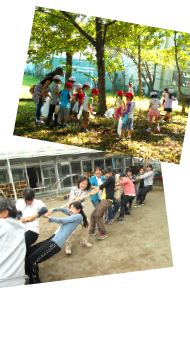 そして肝心の子ども達にとって「もう一度やりたい」と思うほどの楽しい運動会であったことが、翌日からの遊びの様子からもよく分かりました。年少組から年中、年長組混ざっての綱引き大会(教職員との対抗戦もありました!)、玉入れ大会、そして組み立て体操にダンス大会。皆で全力疾走!投げる、跳ねる、大きくジャンプ!!そして重いものを持ち上げて、力もち!!! 一緒に身体を動かし、声をからして応援し、笑い合い、園全体でひとつになって運動会の余韻を楽しみました。