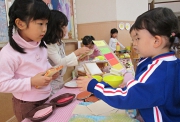 やさしい年長さんと一緒に遊ぶことができて、年中組も年少組も大満足の毎日を送りました。その楽しかった経験を今度は自分たちもしてみたい!と年中組では「ハンバーガーやさん」「忍者めいろ」「クッキーやさん」が出来上がりました。まだ年長さんほど上手には接客できないけれど、してもらった嬉しいおもてなしをやってみようとする姿が見られました。
