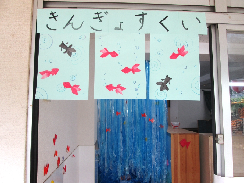 今年は、年長組の金魚すくい遊びが大ヒット!という事で、今年は金魚すくいの店舗を作りました。(7月の保育をみてね。)