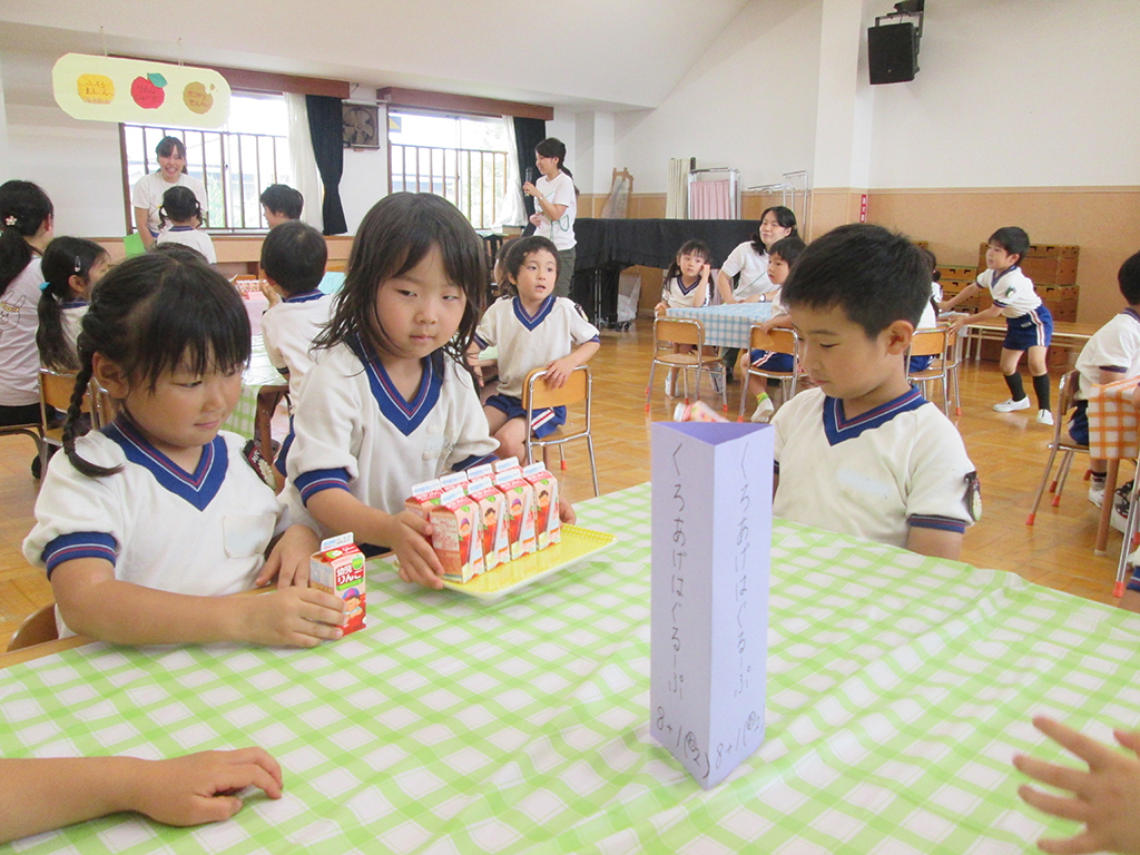 お泊まり保育の一週間前に届いたいずみがもりの地図を手にいざ出発!森に着いたらグループごとに地図を見ながら≪かざぐるまのある木≫を探します。ひなぎく幼稚園のお泊まり保育では、こんな風に子どもたちが豊かなイメージで遊ぶ時間を過ごします。