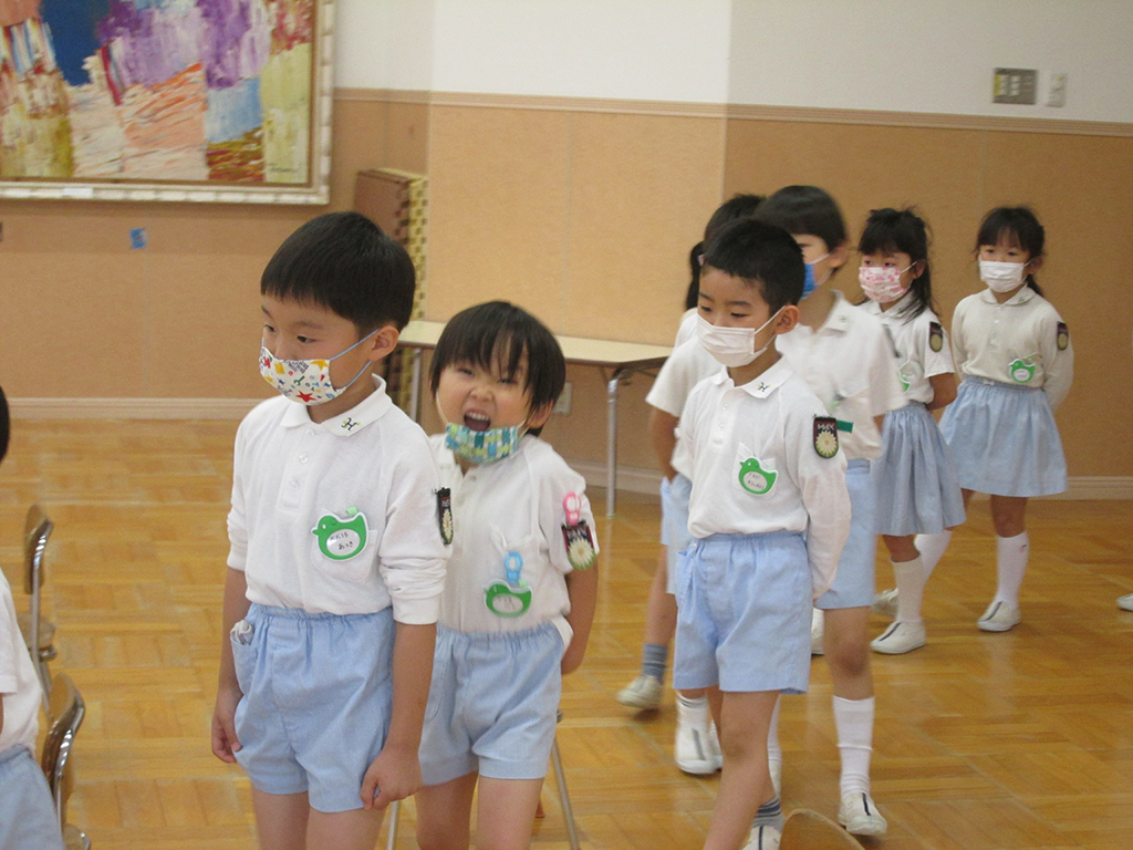 年中組はクラス毎に親子で入園進級式を行いました。休園中に幼稚園が配信した動画の中には新しい讃美歌もありました。みんな家で歌っていたのかしら?新しい歌も立派に歌っていましたよ。