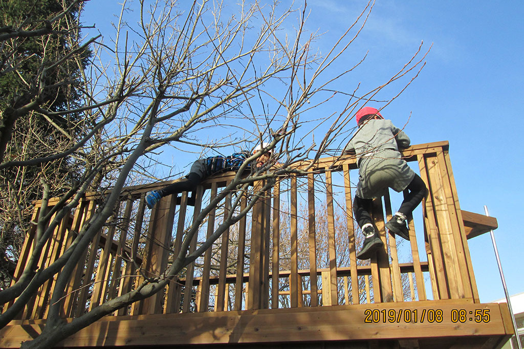 園で子どもたちは、冬ならではの遊びを思う存分楽しんでいます。かるたをやっていて、自分の手札の数や友だちの枚数にも気が付いて比べてみたり、まだ取れていない友だちを応援したり。また、新しい遊具『ツリーハウス』に挑戦していて、「○○ちゃん凄いんだよ。△△とか出来るんだよ。」と自分はまだ出来ないけど、その友だちなら出来ることを我がことのように喜んだり。この時期、子どもたちは、かかわりの中から互いを認め合い、友だちとの距離を縮めていきます。