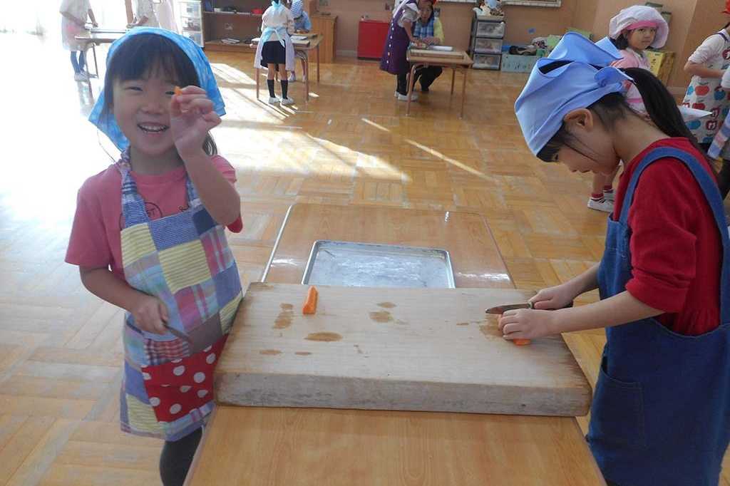 「年長組さんが野菜を切って今日の給食のスープを作ってくれたのよ。」そんな話しを聞きながら、「年長さんすごいね。」「私たちもやってみたいな。」という子どもたちの会話や気持ちに応えようと保育者たちも遊びを支えます。
