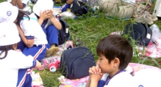 お弁当の時も給食の時も、おやつの時も、感謝のお祈りをして頂きます。もちろん遠足の時でもー。 |